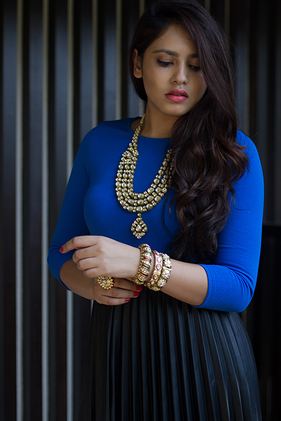 I love paring traditional jewellery with modern, high street pieces to create a balance and break those age old myths! The key to let the jewellery be the hero is by making sure that your base is made up of solid colours. To avoid seeming mundane, pick an ensemble with textured fabrics or pleats. I chose this body con dress and layered it with a faux leather pleated skirt along with this stunning jewellery. I’m not sure where this outfit would fit in but I just loved the contrast it created! So this wedding season, stand out by creating subtle contrasts not just in terms of colours but also the way you style your jewellery and come up with pairings that will blow everyone’s mind. Drop in at Jaipur Jewels, Napean Sea Road, Mumbai and Pitampura, Delhi, to browse through their collection because you are sure to find something that will fit your need perfectly! Also join me on Twitter on 12th December, Friday from 1pm to 3pm for a fun Q&A tweet up where I would be happy to answer any of your wedding season related queries be it what jewellery to pair with an outfit you’ve chosen or what make up would help you accentuate your look to trendy hairstyles and much more! Follow me on @aayushibangur and @Jaipur_Jewels and send in your questions with #JaipurJewels to be part of this. See you there! You can also check out & follow Jaipur Jewels on Facebook & Instagram.