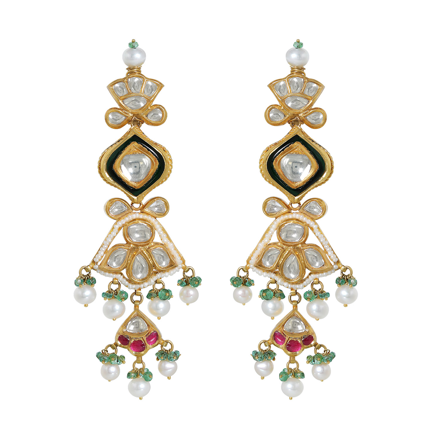 Long Polki Jadau Earring With Pearl Emerald Jhumkis 22K Gold & 14K Gold Back Push